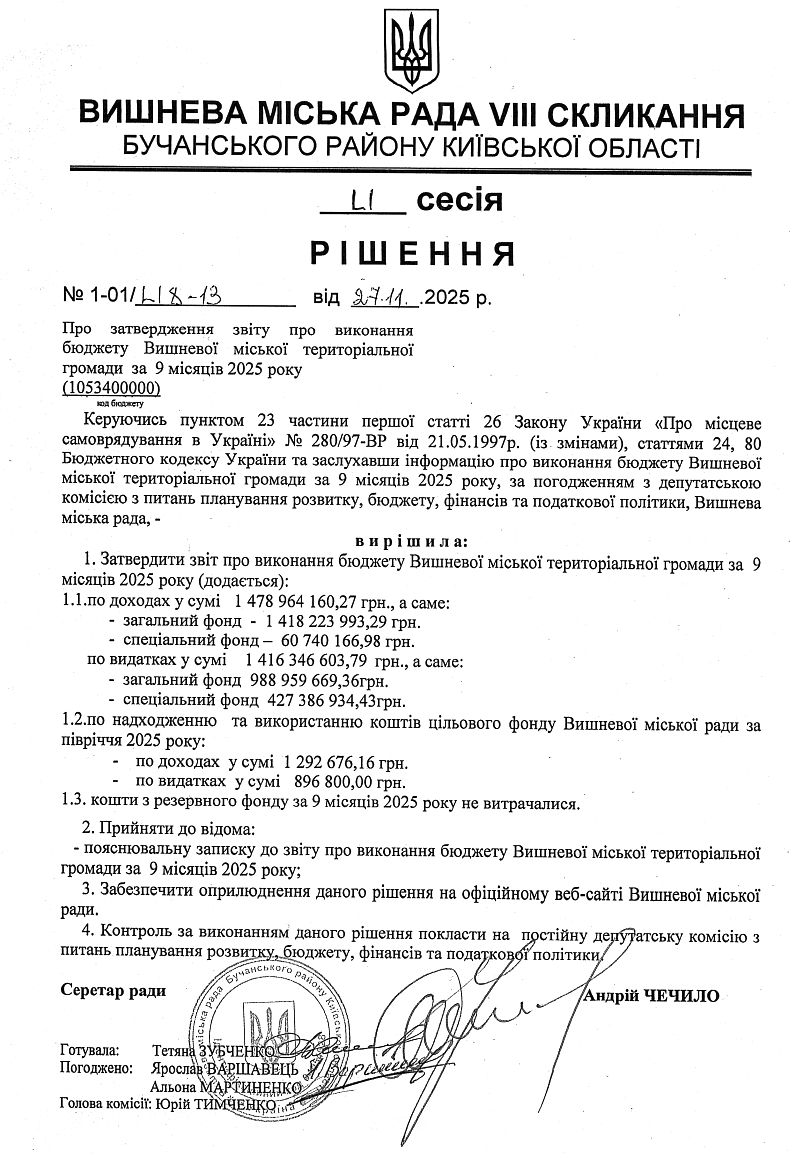 Подивитись: Звіт про виконання бюджету Вишневої міської територіальної громади за 9 місяців 2025 року (1053400000)