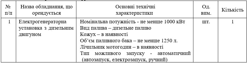 2. Назва предмета закупівлі: Оренда електрогенераторної установки з дизельним двигуном