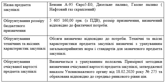 На виконання Постанови Кабінету Міністрів України від 1 серпня 2013 р. № 631«Про затвердження Порядку проведення перевірок закупівель Державною аудиторською службою, її міжрегіональними територіальними органами» таПостанови Кабінету Міністрів України від 11 жовтня 2016 р. № 710 «Про ефективне використання коштів» надається обґрунтування технічних та якісних характеристик предмета закупівлі, розміру бюджетного призначення, очікуваної вартості предмета закупівлі.