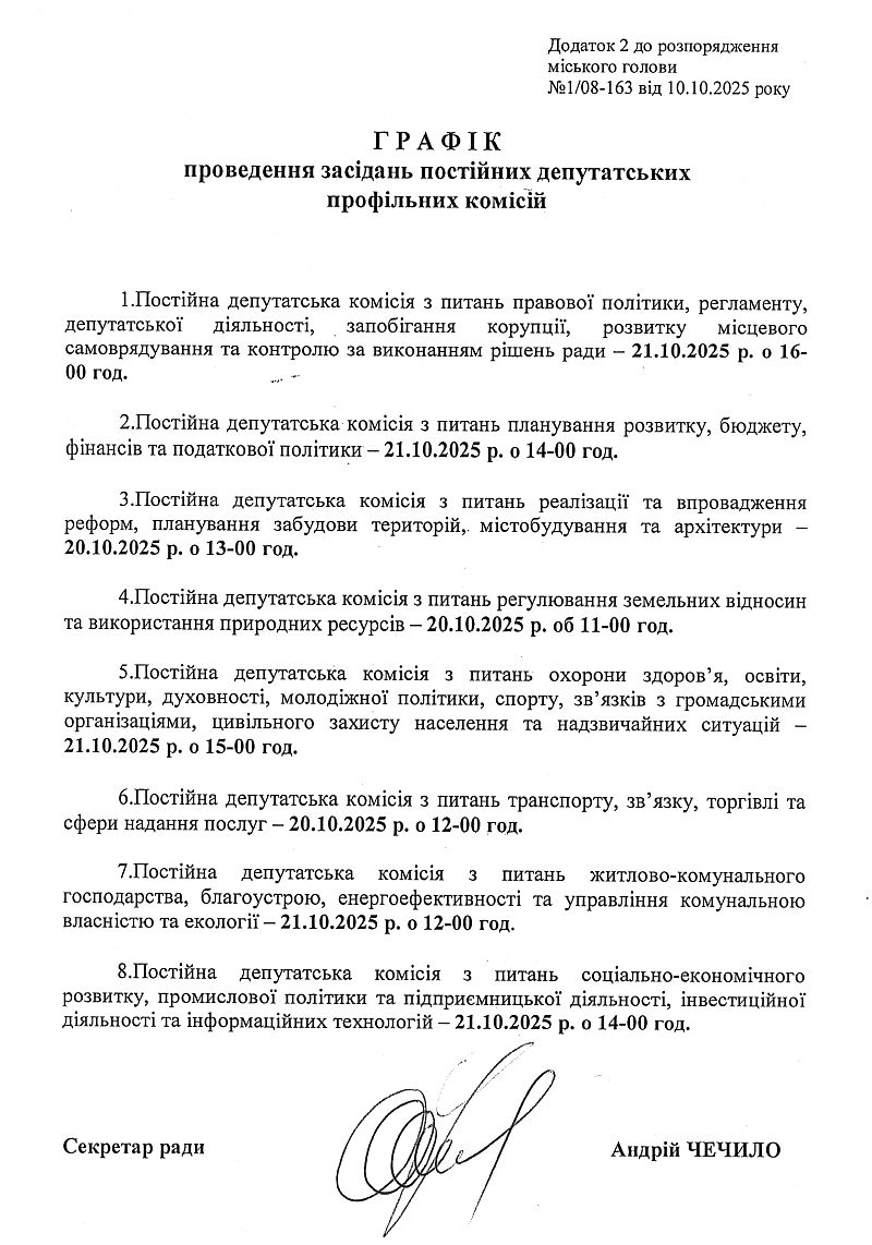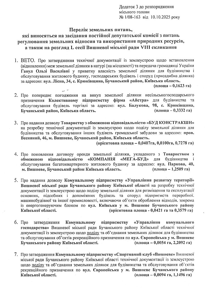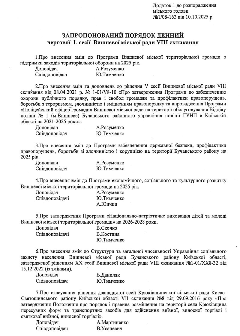 Розпорядження №1\08 -163 від 10 10 2025 р. Про скликання чергової L сесії Вишневої міської ради VIІІ скликання