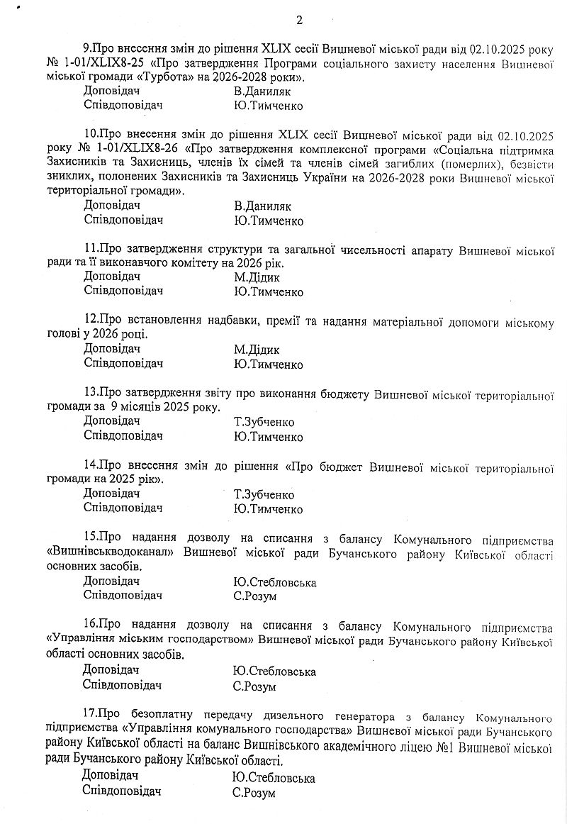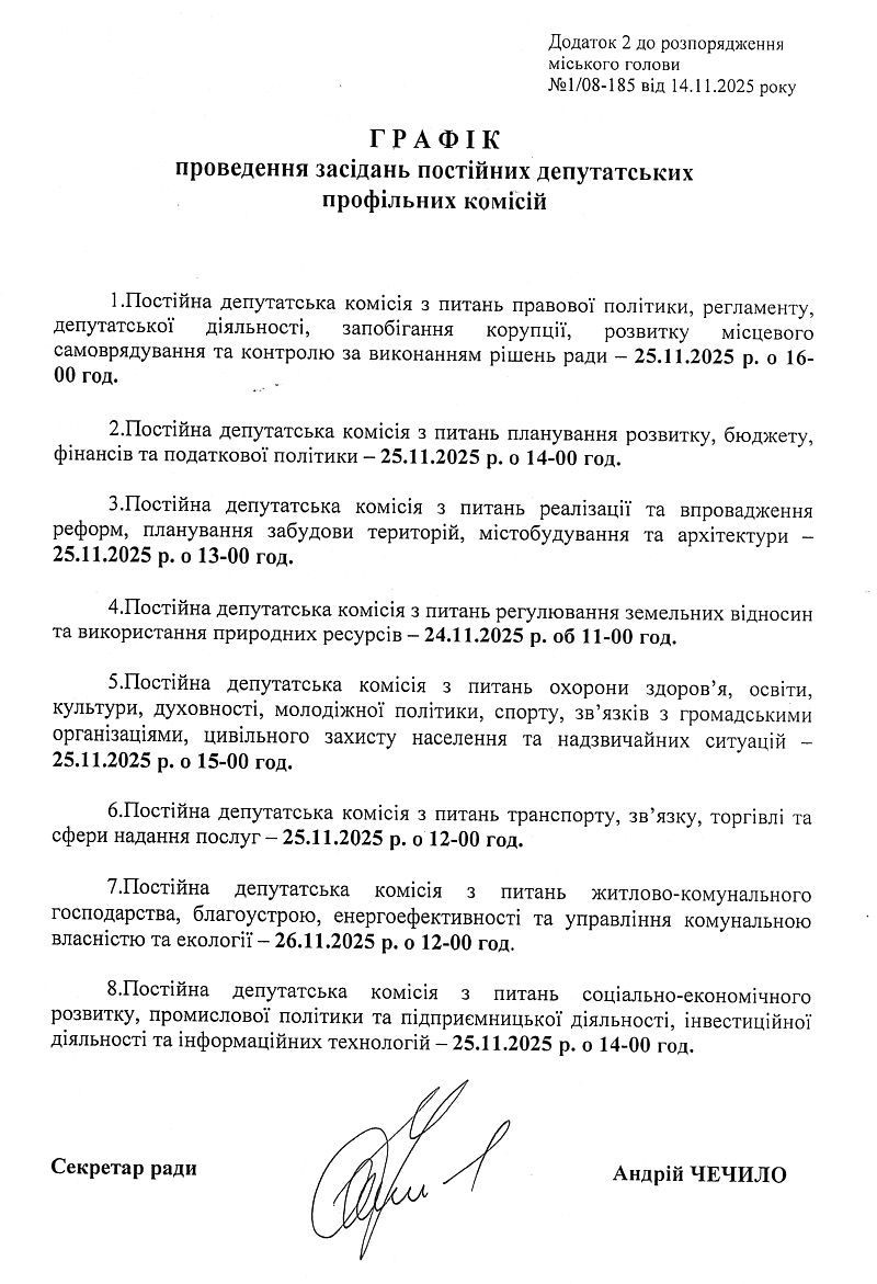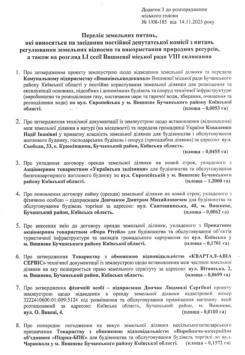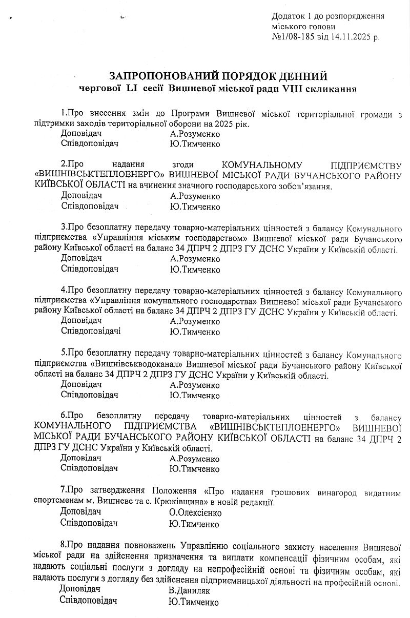 Розпорядження №1\08 -185 від 14 11 2025 р. Про скликання чергової LI сесії Вишневої міської ради VIІІ скликання