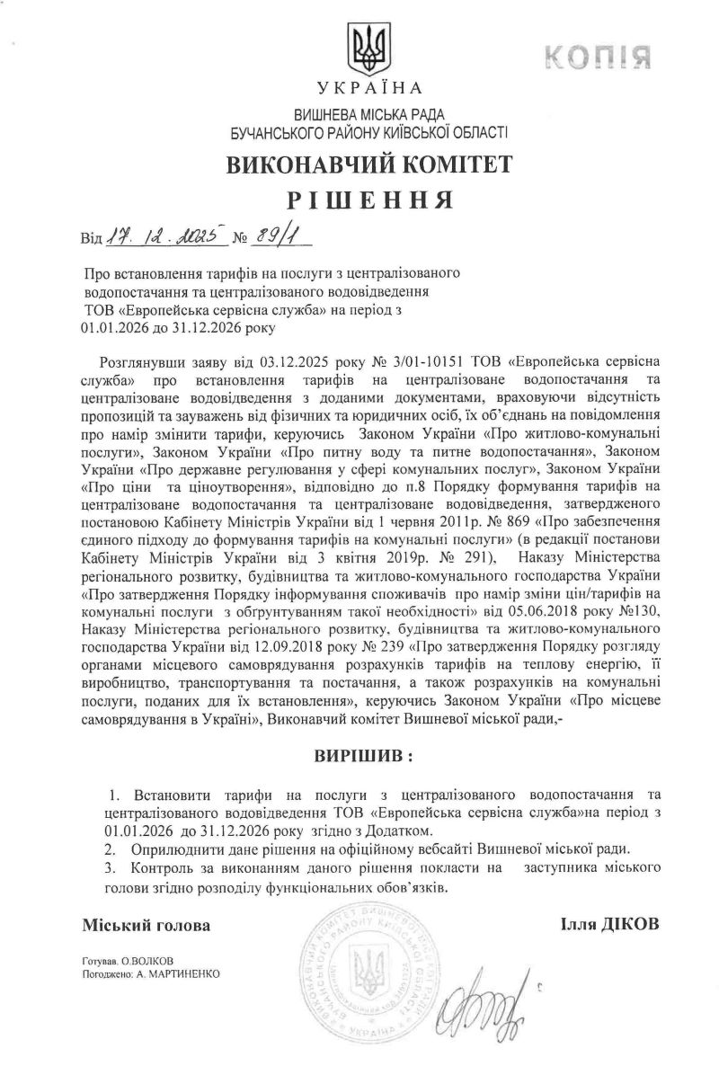 Рішення № 89/1 Про встановлення тарифів на послуги з централізованого водопостачання та водовідведення ТОВ "Європейська сервісна служба" на період з 01.01.2026 до 31.12.2026 року